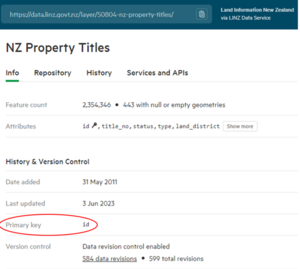 This example shows records from a changeset table for the NZ Parcel Statutory Actions List. In this example the feature identifier is the ‘id’ attribute.