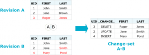 The example below has a schema of first and last names, along with a unique identifier for each person. In revision A of the table there is John, Jane and Roger. In revision B, Mary has been added, Jane has married John, and Roger has been deleted.