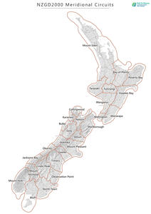There are 28 meridional circuits (9 in the North Island and 19 in the South Island) which make up the set of survey regions used in New Zealand. The term "meridional" refers to the fact that these circuits are run in a north-south direction, aligned with “meridians” of longitude.