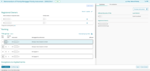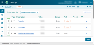 All relevant instruments such as mortgages and encumbrances will be shown in their current priority ranking. To record the new priority order, select the 6-dot icon next to an affected instrument and drag and drop it into its new priority ranking. The relative priority of other instruments will change accordingly.
