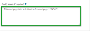 Use the Additional Clauses, Conditions or Intent field to include additional details, such as supplementary clauses and conditions, or to clarify the intent for the mortgage. This is a free text field.