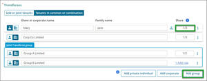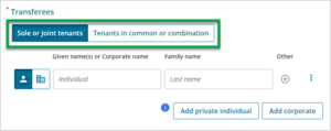 Select whether the Transferees are Sole or joint tenants or Tenants in common or combination. The default setting is Sole or joint tenants.