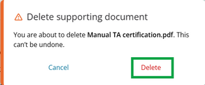 A warning message appears. Select Delete to delete the supporting document. This is irreversible – you will need to re-add the supporting document if you delete it accidentally.