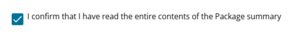 Select the checkbox to confirm you’ve have read the entire contents of the Package summary.