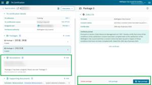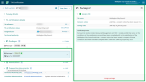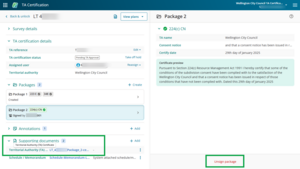- the generated Territorial Authority Certificate document for the package shows in the Supporting documents list