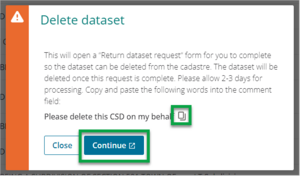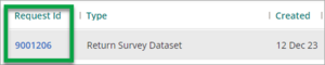- Select the copy icon to copy the recommended text you need to add to the Comment field in the request. Select the Continue button to create the Return Survey Dataset request. The request will open in a new browser tab.