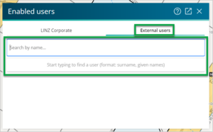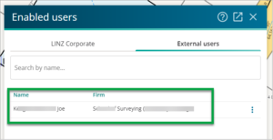 When you search for and select a name, the person you selected is automatically added as an enabled user to the survey, and their name will now appear in the External users tab.