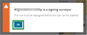 Select Ok to clear the message, then reassign the role of Signing surveyor to the appropriate person. You will now be able to remove the user.