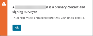 A warning message will appear if you try to remove a Primary Contact or Signing Surveyor before you first reassign the role.