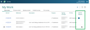 If you have any TA certification requests or other incomplete requests associated to a survey, they are shown in the LINZ/TA requests column.