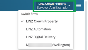 A drop-down appears, listing all firms you are associated to in Landonline. A tick next to the firm name indicates which firm you’re currently logged in under.
