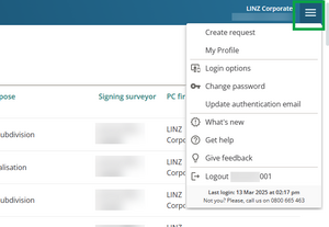 If you work under more than 1 firm, you can left-click on your user name at the top right of the page to switch the firm you are logged into Landonline with.