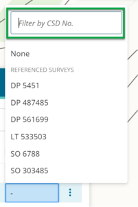 • search for a survey that’s not already in the list by entering a CSD number in the Filter by CSD No. field. Landonline will take a moment to search for all matching surveys, then display these in the drop-down. When you select one of these, it will also be added to the Referenced CSDs tab in the Survey details panel.