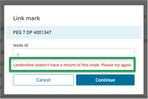 Link mark window with error message 'Landonline doesn't have a record of this node. Please try again'