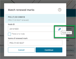 • Use the node picker to select the corresponding existing mark in Landonline or enter the Node ID for the corresponding existing mark.  If there is no existing mark in Landonline, left click in the box next to ‘There is no node’.