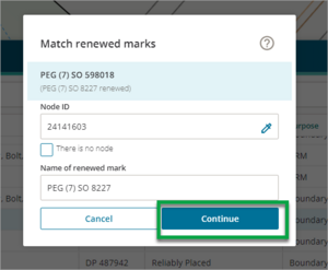 • If there is a valid node id, the Name of renewed mark field will be automatically populated.  Otherwise type in the name of the original mark name. This mark description will be added automatically to the diagrams when you generate your plans.