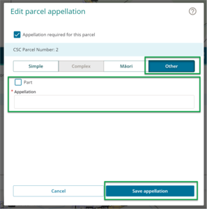 - If checked, you must enter information under the relevant tab – Simple, Complex (greyed out), Māori land, or Other. See Parcel appellation for further details.