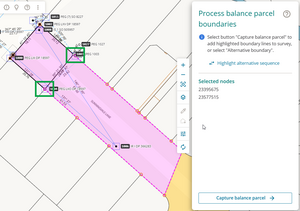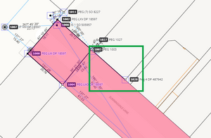 Landonline automatically chooses which path to take around the underlying parcel. A pink dashed line appears around the parcel boundary that will be captured.