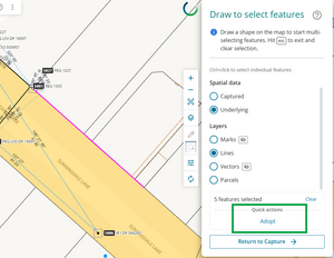 Method 2: Adopt multiple lines using the draw to select tool – this method is the quickest way of adopting many lines from multiple parcels. A common scenario where this is helpful is where there is a large parcel including easements that are allowed to be accepted – so long as the rules allow it. The risk is that it is relatively easy to accidentally miss a small line or add extra unwanted lines in the process.