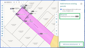 Left-click on the underlying parcel in the spatial view to select it. This should be the existing road parcel that you are creating a balance parcel over. Select Add/remove selected parcels to add the parcel to the Existing parcels panel.