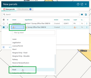 Double-click the Intent field for the new parcel. Select Road from the dropdown list.