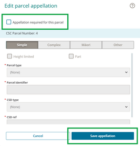 Untick Appellation required for this parcel. The remaining fields will change to grey. Select Save appellation.