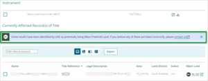 When Instruments with Titles, or multi-results with Titles have been identified as potentially being Māori Freehold Land, and a link to Pātaka Whenua Online Portal is provided, this disclaimer will be used.