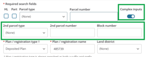 For Complex appellation types, toggle Complex inputs to On. This will give you options for a 2nd parcel type, number and block number if needed.