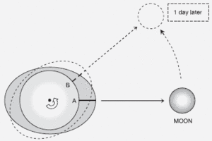 While the Earth rotates on its axis the moon moves in the same direction around its orbit, turning the lunar tidal bulge as it goes. The following diagram shows the Earth-moon system as viewed from above the North Pole. Initially an observer at position A sees the tidal bulge pointed in the direction of the moon. Twenty-four hours later the observer returns to point A, but during the intervening day the moon has moved along its orbit and rotated the tidal bulge so the observer must wait until reaching point B before catching up with the lunar bulge again.