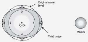 The following diagram shows the Earth and moon as viewed from above the North Pole. An observer under the water on the Earth at position 1 is beneath one of the water bulges and would be experiencing a high tide. A quarter of a revolution later, at position 2 where the original water level has been depressed, a low tide would be seen. The high tide, low tide sequence repeats as the observer moves around through points 3 and 4.