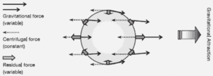 The Earth and moon are held together by gravitational attraction, which is balanced at the common centre of gravity by an equal and opposite centrifugal force. Away from the centre of gravity the strength of the gravitational force changes as the distance to the moon varies. The centrifugal force, however, remains constant everywhere on Earth. Therefore, except at the centre of gravity, the gravitational and centrifugal forces are not the same and this inequality creates a residual force. These three forces are depicted in the following diagram.