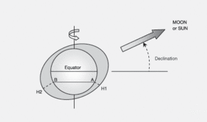 The observer at point A is under a tidal bulge and sees a high tide with height H1. Twelve hours later the observer is at point B and, once again, sees another high tide, this one has height H2. Now H2 is greater that H1 because the declination of the moon has rotated the tidal bulge. This difference between the heights of successive high tides is known as the diurnal inequality. As the moon approaches the plane of the equator, H1 and H2 become equal and the diurnal inequality disappears.