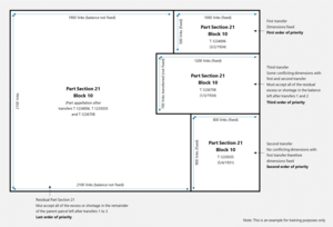 Surveyors will come across situations whereby more than one parcel of land has been transferred out of the parent title or grant at the same time. Provided they are the first transfers out, under the order of priority all parcels transferred on the same date are simultaneous transfers and are of equal evidential weight. In other words, provided they are the first transfers the dimensions of all parcels transferred simultaneously from the parent title or grant must be respected exactly.