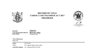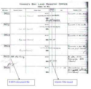 Interim titles should not be confused with limited titles. Interim titles are specific to the Hawke’s Bay Land District. They arose because the fires following the Napier earthquake destroyed the original records and there was no register record or duplicate to fall back on.