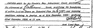 Latham Street was significantly affected by earthquake ground movement and in December 1932 the Hawke’s Bay Adjustment Court, under the Napier Alignment Regulations 1932, issued Order 4923 establishing the re-alignment of Latham Street and surrounding streets.