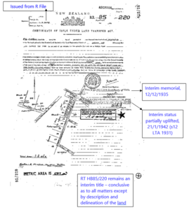 Over time, and in accordance with section 12 LTA 1931, all interim titles have now become conclusive as to all matters except the description and delineation of the land.  Interim titles are generally endorsed with the memorial… this certificate has by effluxion of time become conclusive as defined by Section 2 of the Land Transfer (Hawke’s Bay) Act 1931 as to all matters except the description and delineation of the land, however the absence of this memorial does not alter this position. Provided the original interim title was issued more than 6 years ago (most will have issued long before now) section 12 LTA 1931 will apply to make it conclusive other than as to description and delineation of land.