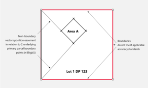 Where the non-primary parcel does not coincide with the underlying parcel it can be positioned in relation to boundaries that meet the applicable accuracy standards (see figure 7 below). If none of the boundaries meet the applicable accuracy standard it must be positioned using the survey provisions in rule 51 where class A or B accuracies apply. Alternatively, the survey provisions in rule 53 apply for class C accuracies.