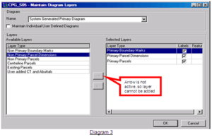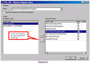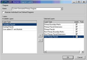 - define identical non-primary diagrams to display secondary and tertiary parcels. This includes the ability to hide boundary lines and labels of non-required parcels to give emphasis to selected non-primary diagrams on both the primary diagram and non-primary diagram sheets.