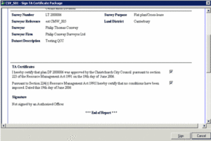 When a subdivision dealing is submitted and the associated survey plan includes TA certificate packages that remain unsigned, the dealing will be flagged with a warning that the survey has pending TA certifications. This prevents the dealing proceeding unless the flag is cleared or a LINZ officer has received confirmation from the relevant Territorial Authority (TA) that no further certifications are required.