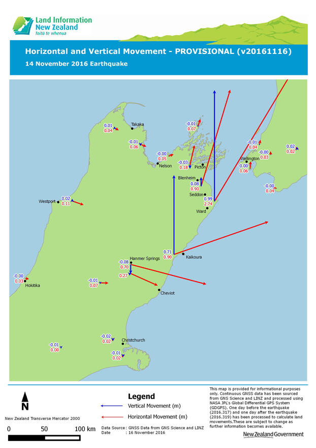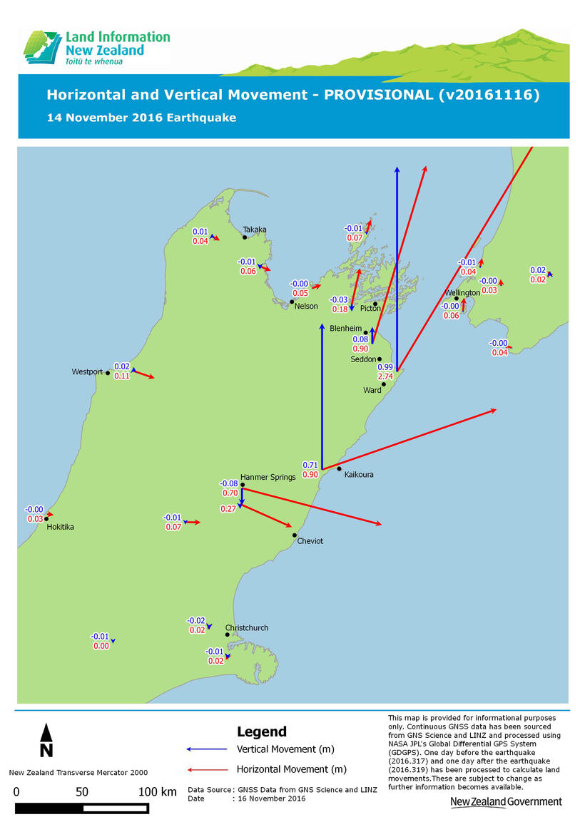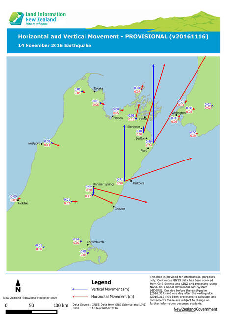 On Monday 14 November 2016, the magnitude 7.8 Kaikoura Earthquake resulted in ground movements exceeding 5cm from the middle of the South Island to the bottom of the North Island.