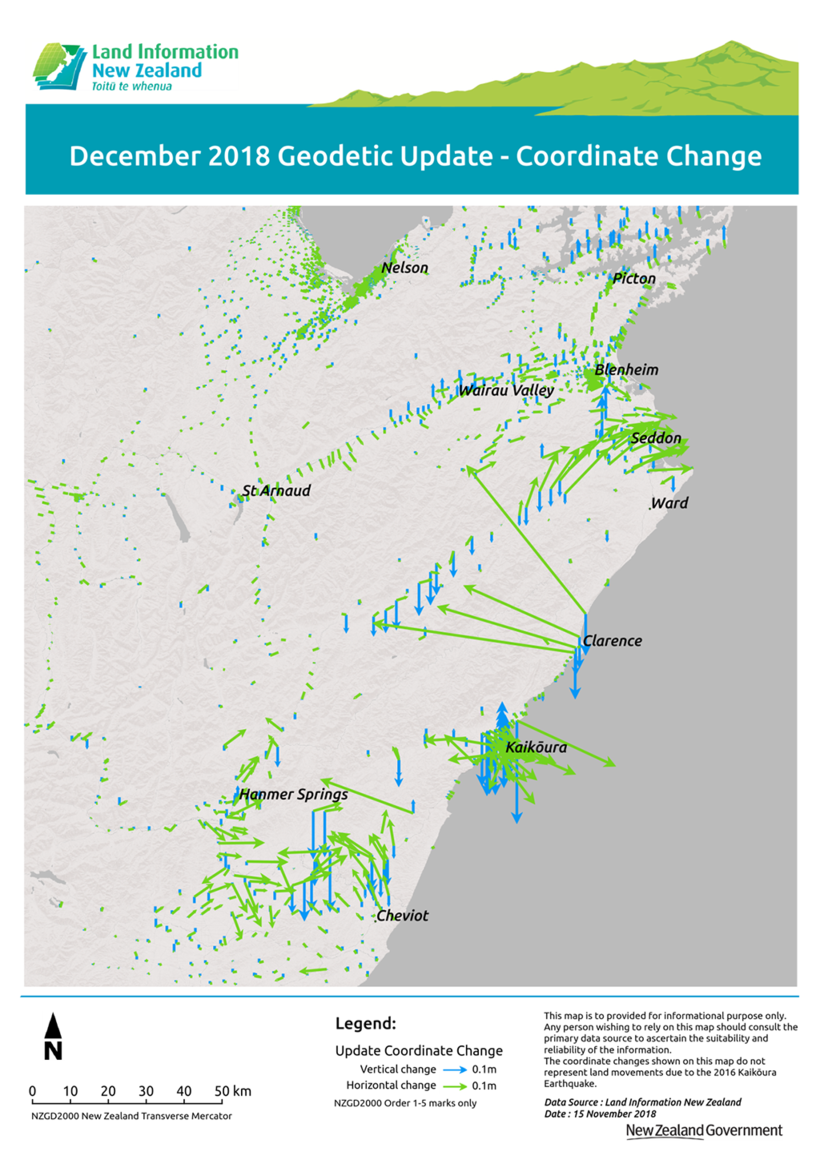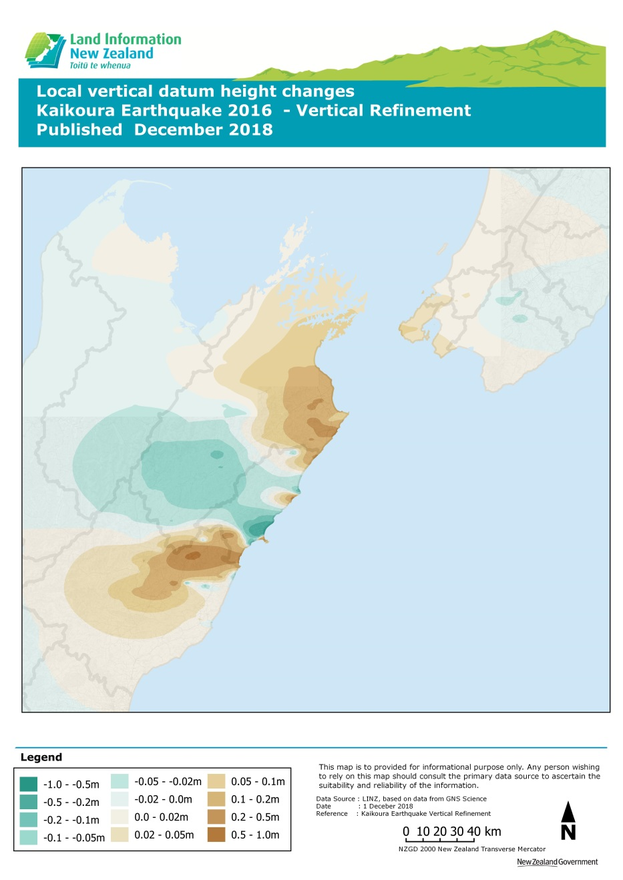 The 2016 Kaikoura earthquake resulted in significant vertical movement in much of the north part of the South Island and lower part of the North Island. As such the local vertical datums in these areas were updated with a vertical deformation patch in January 2018.