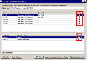 When the PRS screen displays as part of the submit process, all RTs in the dealing are listed. Beside each RT is a box that, by default, will be ticked. If you leave all boxes ticked, you will receive and will be charged for a post registration copy of each RT.