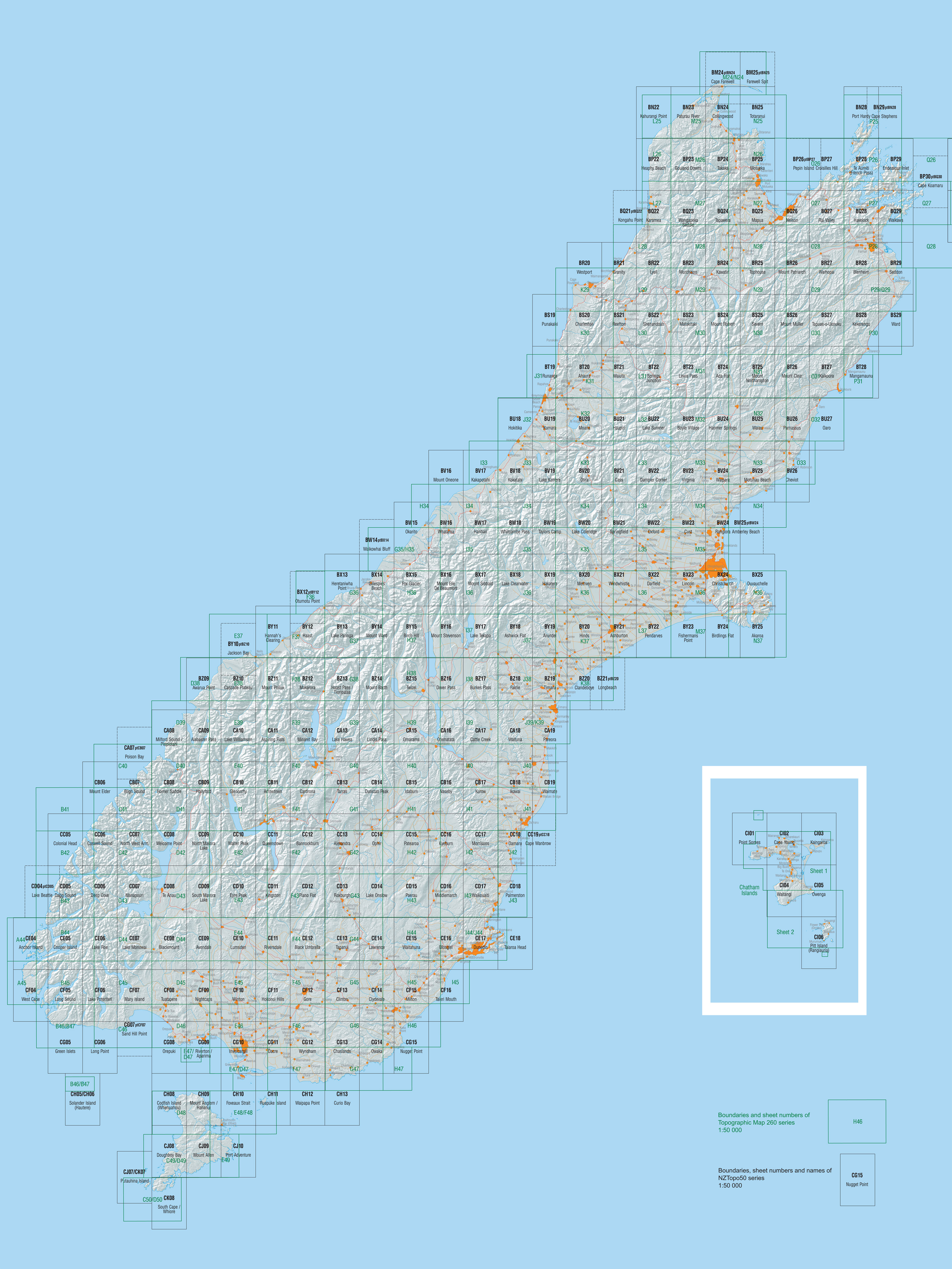 The sheet index diagrams show you the boundaries and names for each of the 451 Topo50 A1 portrait sheets, including the 6 Chatham Islands sheets.